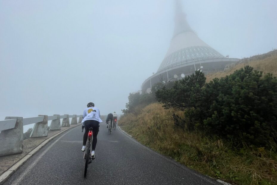 Rychlé tempo v rovinatém terénu výrazně ochablo za Osečnou, odkud se silnice začala zvedat na Ještědsko-kozákovský hřbet. Stoupání v nejtěžších pasážích přesáhlo 10 % a přímo pod vrcholem Ještědu ještě přitvrdilo. Odměnou za pekelnou dřinu byly ovšem nádherné výhledy… do mlhavého oparu, který proslulý kopec nad Libercem v echt podzimním dnu obalil. Panoramata máme schovaná na příště.